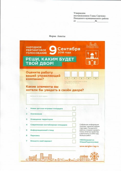 1. Провести 09.09.2018 года с 8.00 до 20.00 анкетирование жителей Сергиево-Посадского муниципального района Московской области (далее-анкетирование). Анкетирование носит анонимный характер.