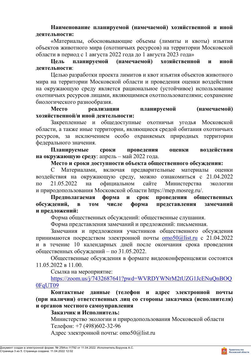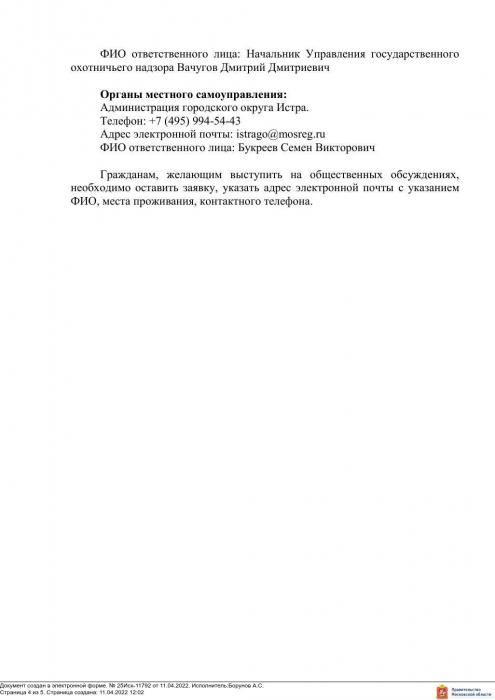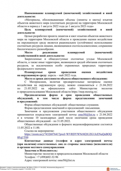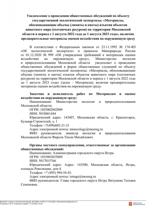Министерство экологии и природопользования Московской области в соответствии с Федеральным законом от 23.11.1995 № 174-ФЗ «Об экологической экспертизе» и приказом Минприроды России от 01.12.2020 № 999 «Об утверждении требований к материалам оценки воздействия на окружающую среду» направляет образец «Уведомления о проведении общественных обсуждений по объекту государственной экологической экспертизы: «Материалы, обосновывающие объемы (лимиты и квоты) изъятия объектов животного мира (охотничьих ресурсов) на территории Московской области в период с 1 августа 2022 года до 1 августа 2023 года», включая предварительные материалы оценки воздействия на окружающую среду». Дополнительно сообщаем, что информацию о согласии проведения общественных обсуждений в Администрации городского округа Истра необходимо направить на адрес электронной почты: BorunovAnS@mosreg.ru до 14.04.2022 года. Контактное лицо Министерства: Борунов Андрей Сергеевич, телефон +7-915-054-25-95.