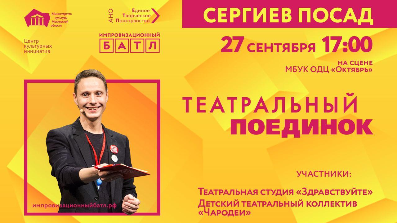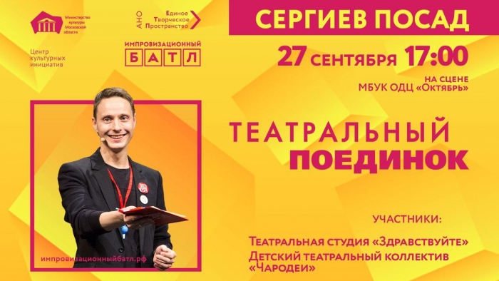 С 7 сентября в Сергиевом Посаде стартует областной конкурс по актёрской импровизации «Театральный поединок». Учащиеся Театральной студии «Здравствуйте» и Детского театрального коллектива «Чародеи» станут участниками практических мастер-классов по актёрской импровизации от актёров Москвы и Подмосковья.