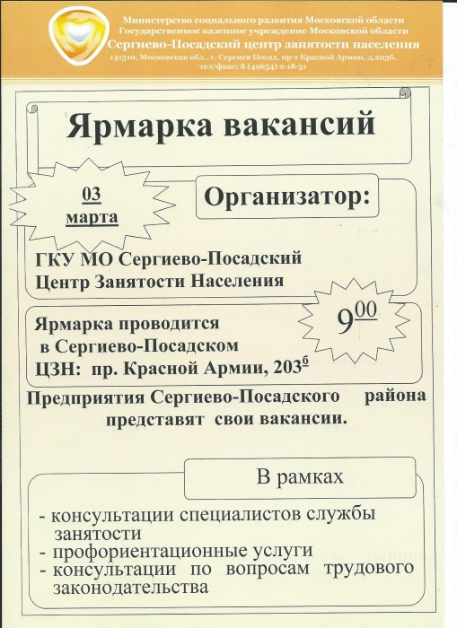 3 марта 2017 г. с 9:00 в центре занятости населения, расположенном по адресу: г. Сергиев Посад, пр. Красной Армии, д. 203-б пройдет ярмарка вакансий. Предприятия Сергиево-Посадского района представят свои вакансии.