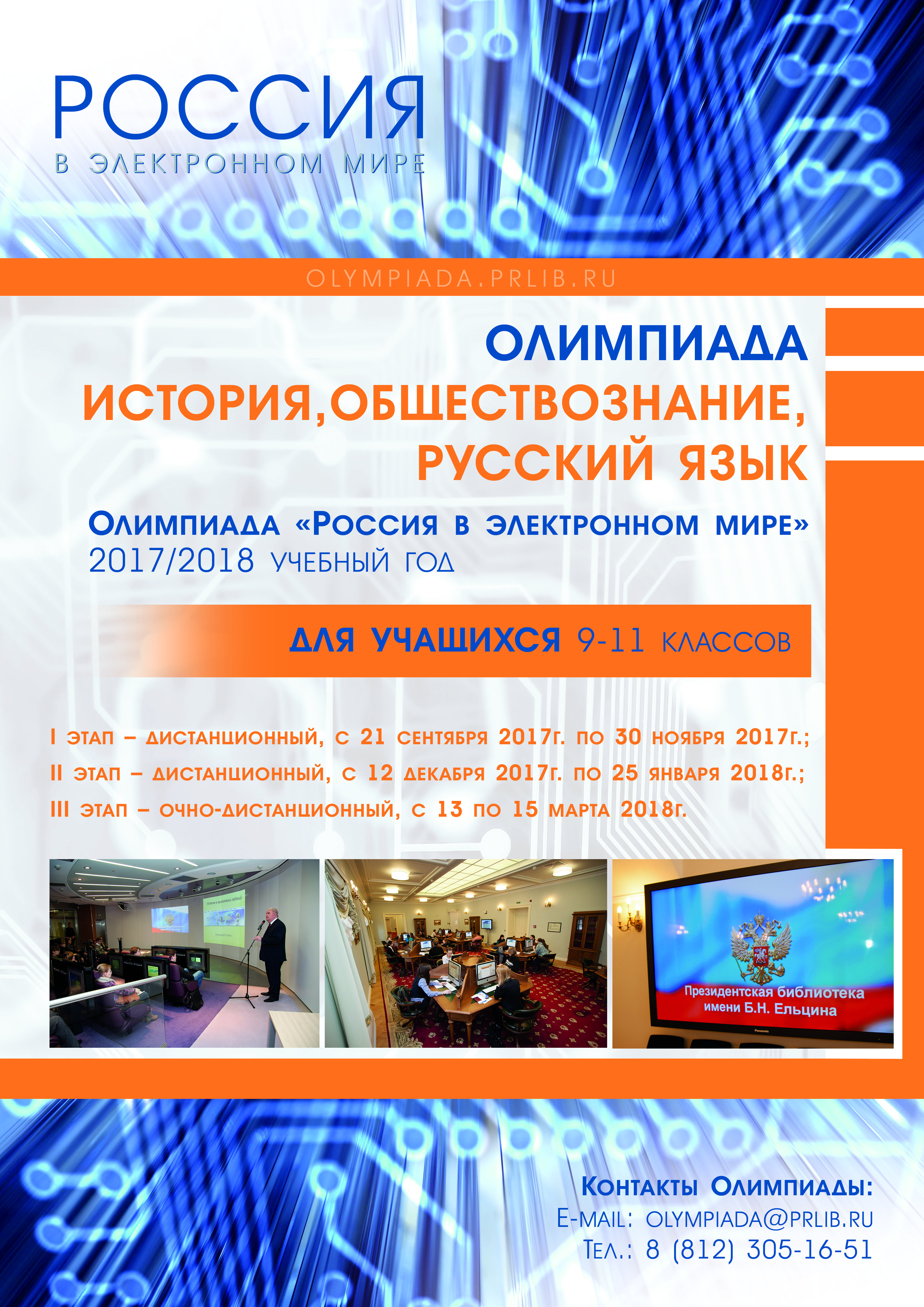 Президентская библиотека им. Б.Н. Ельцина совместно с РГПУ им. А.И. Герцена проводит в 2017/2018 учебном году ежегодную олимпиаду школьников «Россия в электронном мире».