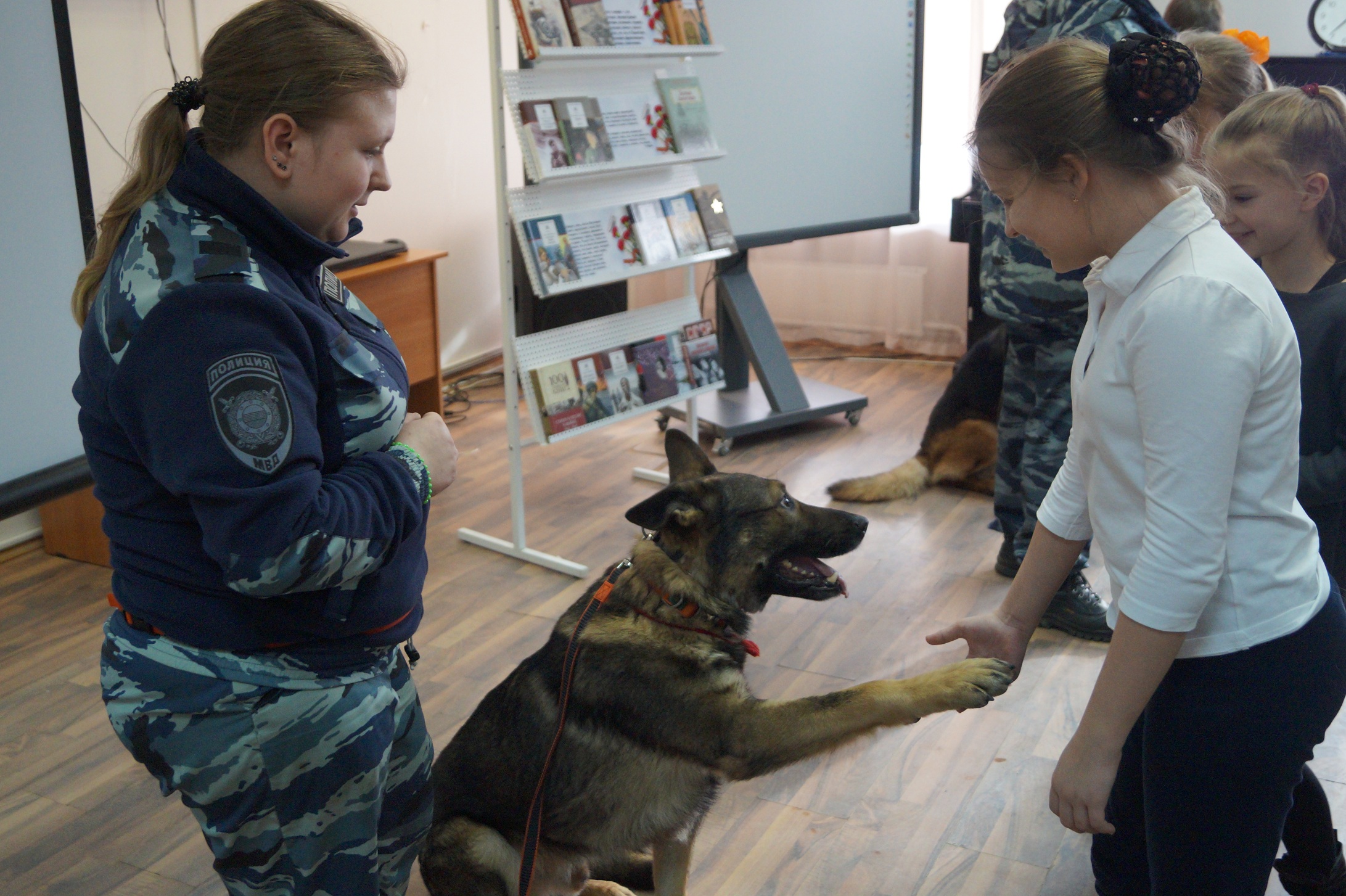 Для работников библиотеки и школьников сотрудники полиции со служебными собаками показали отработанные команды «Сидеть», «Лежать», «Стоять» и «Рядом».