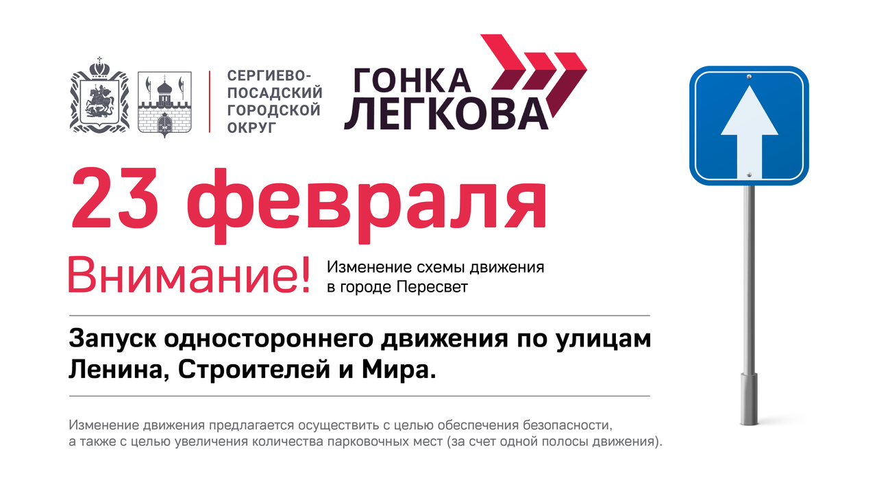 Информируем о изменении схемы движения в городе Пересвет в день проведения мероприятия 23 февраля 2024 года, а именно: запуск одностороннего движения по улицам Ленина, Строителей и Мира. Изменение движения осуществляется для обеспечения безопасности, а также с целью увеличения количества парковочных мест (за счет одной полосы движения).